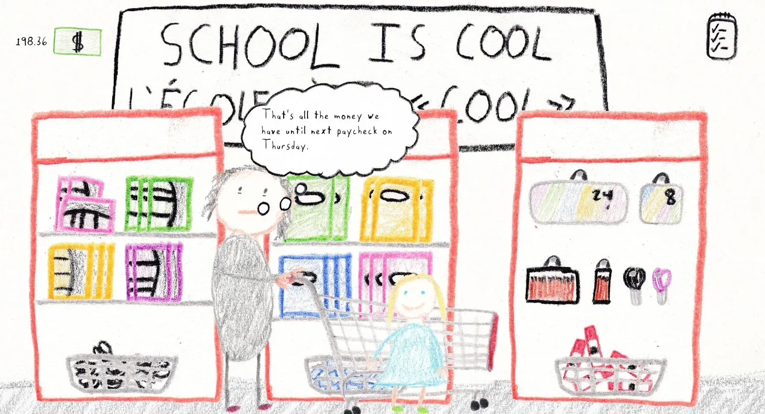 Camille and Laura is a point-and-click game by BonjourBorzoi about Camille, a five-year-old starting school for the first time, and Laura, her single mother, trying to make ends meet. You play as Laura and spend most of your time crossing the crayon-drawn rooms clicking on cabinets, making breakfast, or answering emails. All in, Camille and Laura is about two hours long, spanning five in-game days of much the same (with a few major standout moments).