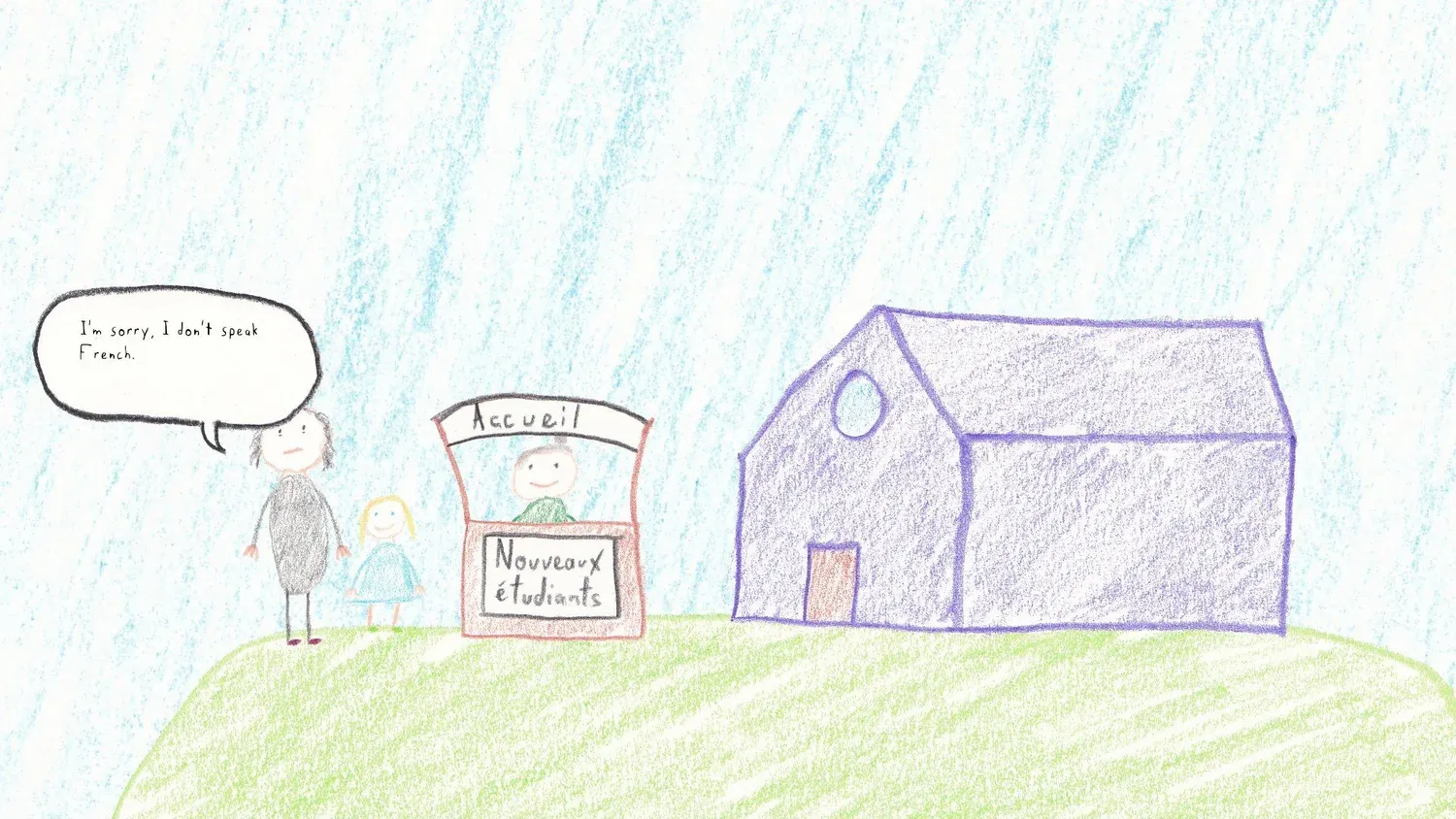 After breakfast, you take Camille to school. You never see Camille’s school journey, and it’s only ever told to you in the sometimes nonsensical way that a five-year-old tells a story. But there is an arc here as well that pokes at all the tiny, fearful inadequacies we feel as parents. On the first day, you soothe Camille, on another day, she fights school, and on a third day, you arrive late and are held after by the teacher. When I bought school supplies the previous day, I chose the small box of colored pencils—because I couldn’t afford the bigger box—and Camille has noticed. That same day was the first day Camille excitedly ran off to class, a small dotted speech bubble above Laura’s head containing the “I love you” she couldn’t say fast enough.
