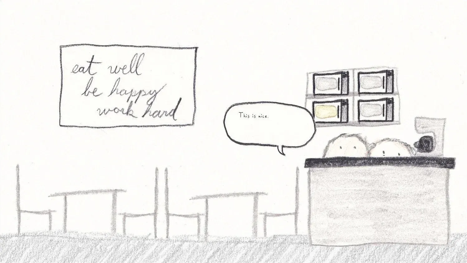 Next, you’re off to work, where you primarily respond to, delete, or reply-all to an ever-mounting pile of emails as the clock moves incredibly slowly. Mid-day, you’ll grab your lunch and sometimes have a chat with your too-bubbly coworker. Again, the simplicity that Camille and Laura draws strikes true; I immediately saw myself in Laura when she hid behind a counter, hoping her coworkers wouldn’t notice her. I felt the boredom and hopelessness slip in as the inbox climbed from 0 to 500 throughout the week.