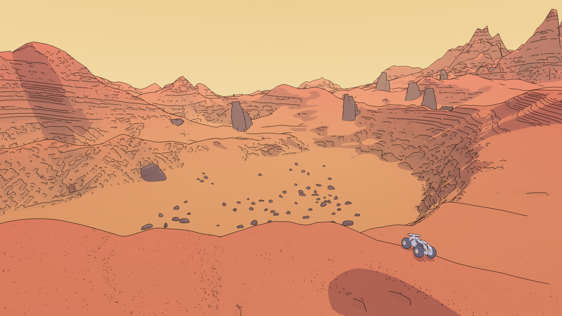 Robotic prat-falls not enough to get you chuckling? I guarantee the first time you put the throttle down and start kicking up dust across Mars and Dan Golding’s soundtrack kicks in you’ll be grinning like a school kid. Probably most well-known for the music for Untitled Goose Game, Dan Golding crushes what I have described as “The soundtrack from Drive, but happy” or “Carpenter Brut in the daytime.” The upbeat vaporwave tunes are infinitely replayable and fit perfectly in the very pared down landscape and lack of UI. All of Mars First Logistics’ sound design is impeccable, but I’ll never stop listening to “Data Box” for the rest of my life.