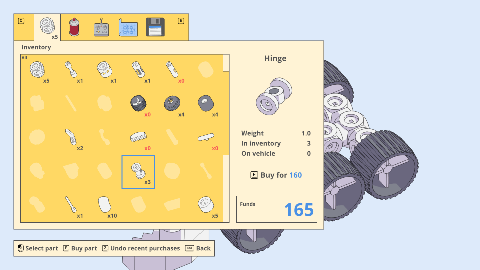 When you’re not busy schlepping TVs or watermelons across Mars, you can also just load up your favorite scouting car and drive across the dunes. As you continue to play, contracts will get further from the main base you start at, so you need to extend your radio range. It’s not super difficult to do—just zip around the landscape and drop an antenna for a negligible amount of currency—but I enjoy being able to switch mental modes and idly speed across the world trying to find the perfect place to efficiently place a radio tower. Because Mars First Logistics knows what it’s doing: you’re trying to optimize radio placement, but you’re also thinking about how the rover works, how the pieces you just acquired could make up something truly ghoulish, and how that might just solve the challenge of a particular object you haven’t cracked yet. Maybe those extra big wheels will help traverse a mud-pit, or those bearing parts could be used to make a double-bogie suspension, just like on Curiosity.