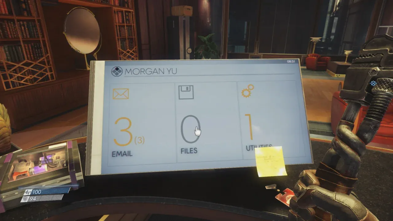 Throughout Prey, you've been interacting with these really large, obnoxious computer screens with three main menus: Emails, Files, and Utilities. The 30+ inch displays are trisected by these menus, a seemingly odd aesthetic choice that only really makes sense once you pick up the Huntress. Emails contain, as you expect, messages between crew members, and the files section usually contains audio logs or schematics for the fabricator. Sometimes it's useful to read messages or download a schematic from afar, but where the Huntress really shines is its ability to trigger utilities: a menu that allows the player to open doors, toggle turrets on or off, or turn on important level distractions.